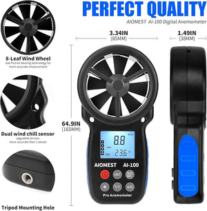 Digital Anemometer, Handheld Wind Speed Meter AI-100, Airflow Gauge Measures Air Temperature ℃/℉ Velocity for HVAC with Wind Chill Backlight