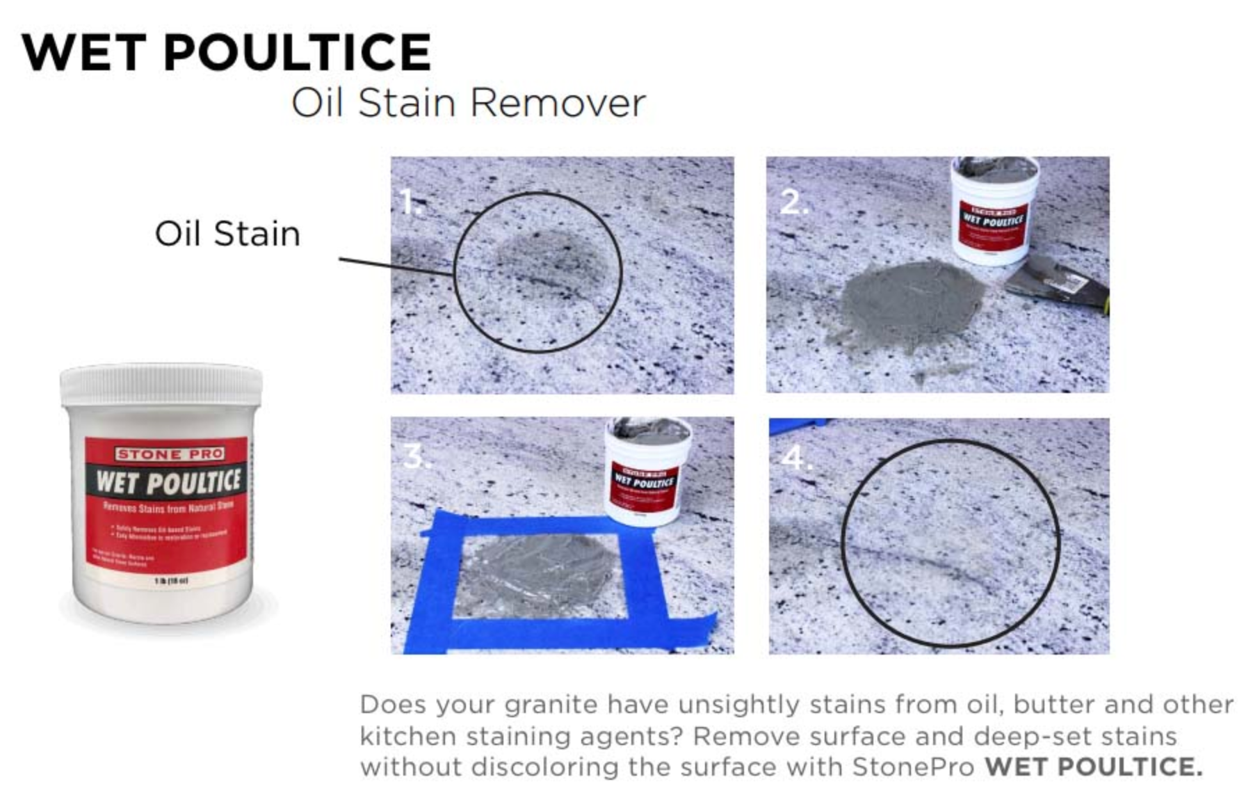 Wet Poultice safely removes surface and deep set stains without discoloring the stone surface. Its non-acidic formula will not affect even the most sensitive stone.