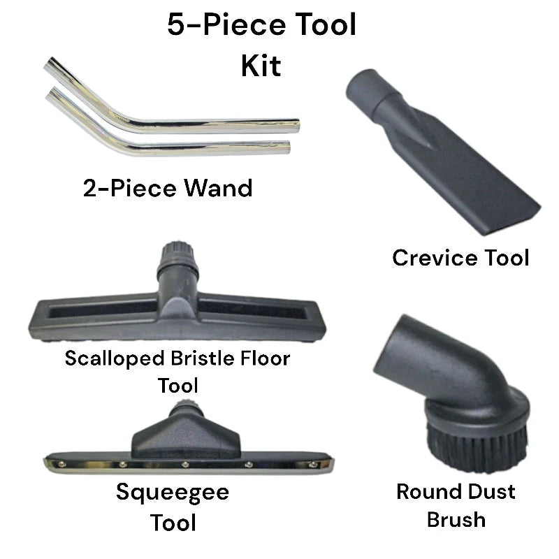 • Included Tool Kit (5 pieces): Crevice tool, wet nozzle, dry floor tool, hose, wand